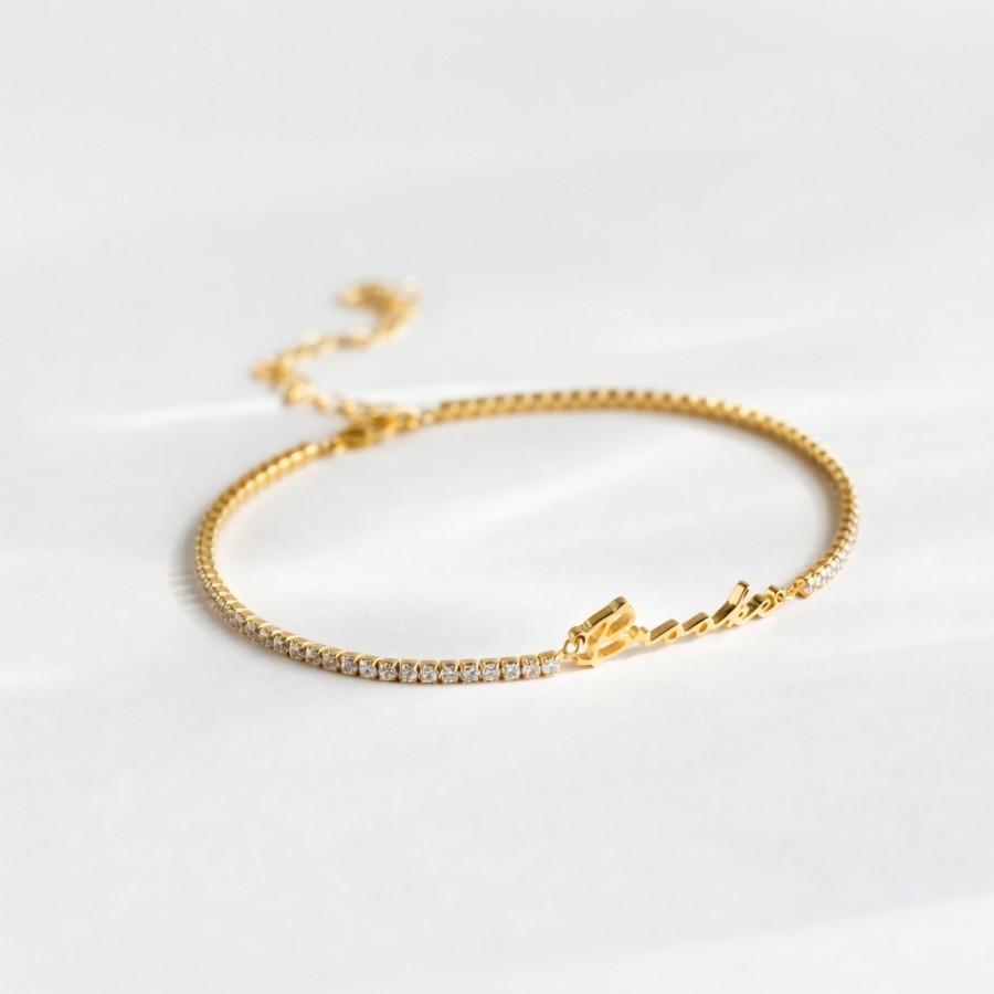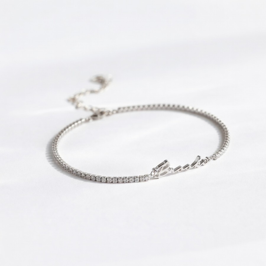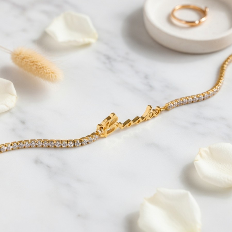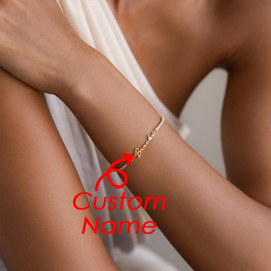 Personalized with any name or word, this delicate diamond bracelet features a sleek nameplate paired with sparkling CZ diamonds. Available in gold and silver finishes, it’s lightweight, waterproof, and perfect for everyday wear or gifting someone you love.