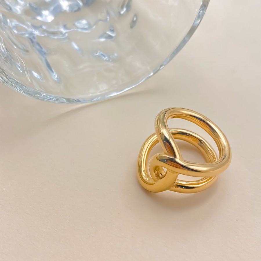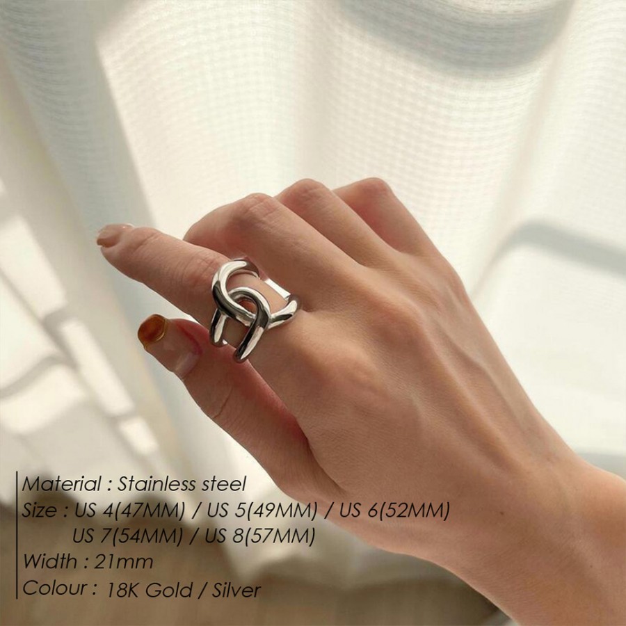 A bold twisted knot statement ring with a smooth polished finish, crafted in waterproof stainless steel and available in gold and silver tones. The interlocking design adds modern geometric appeal, perfect for stacking or wearing solo to elevate everyday looks