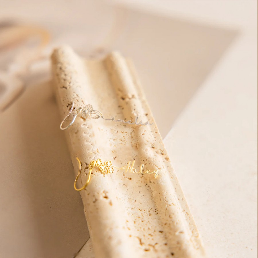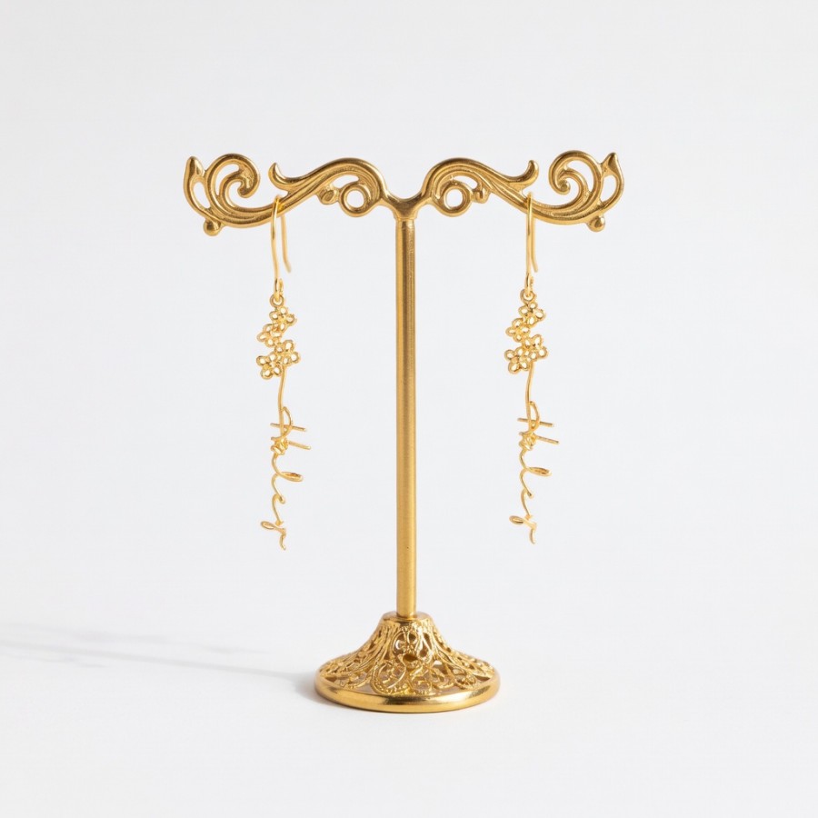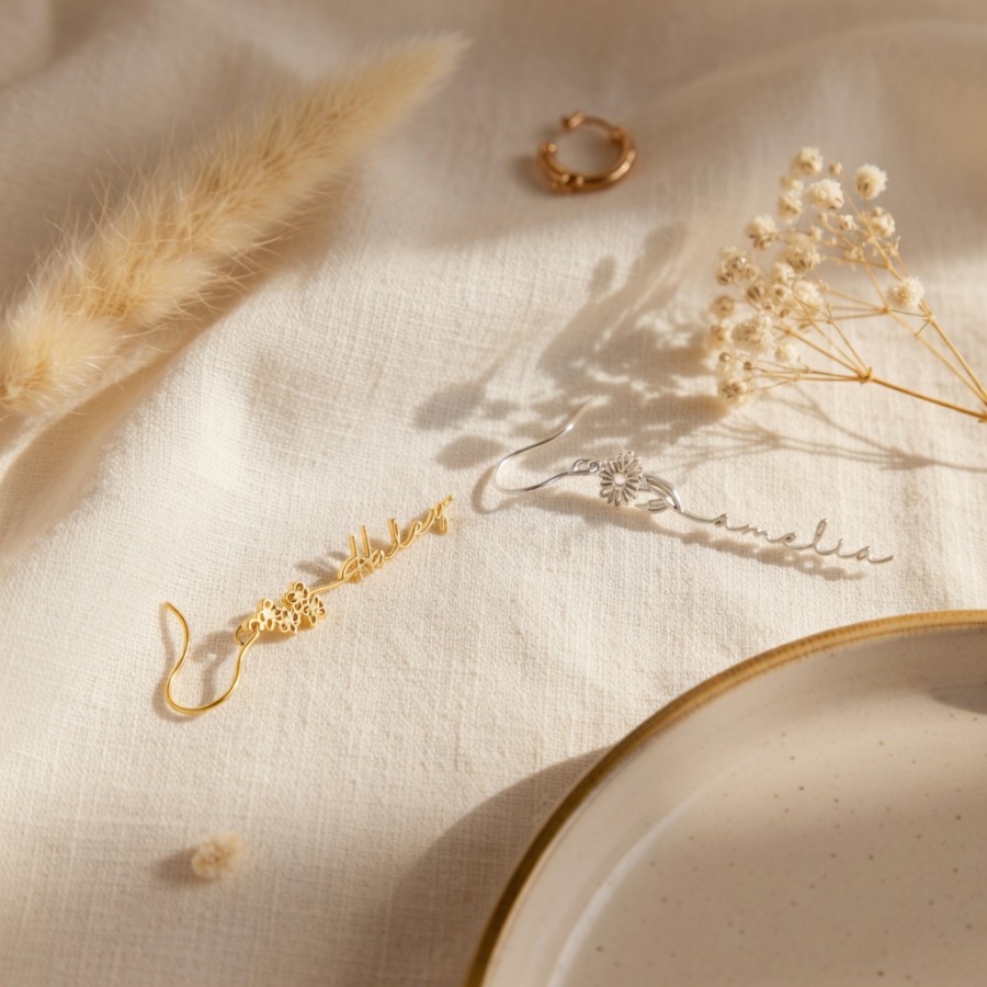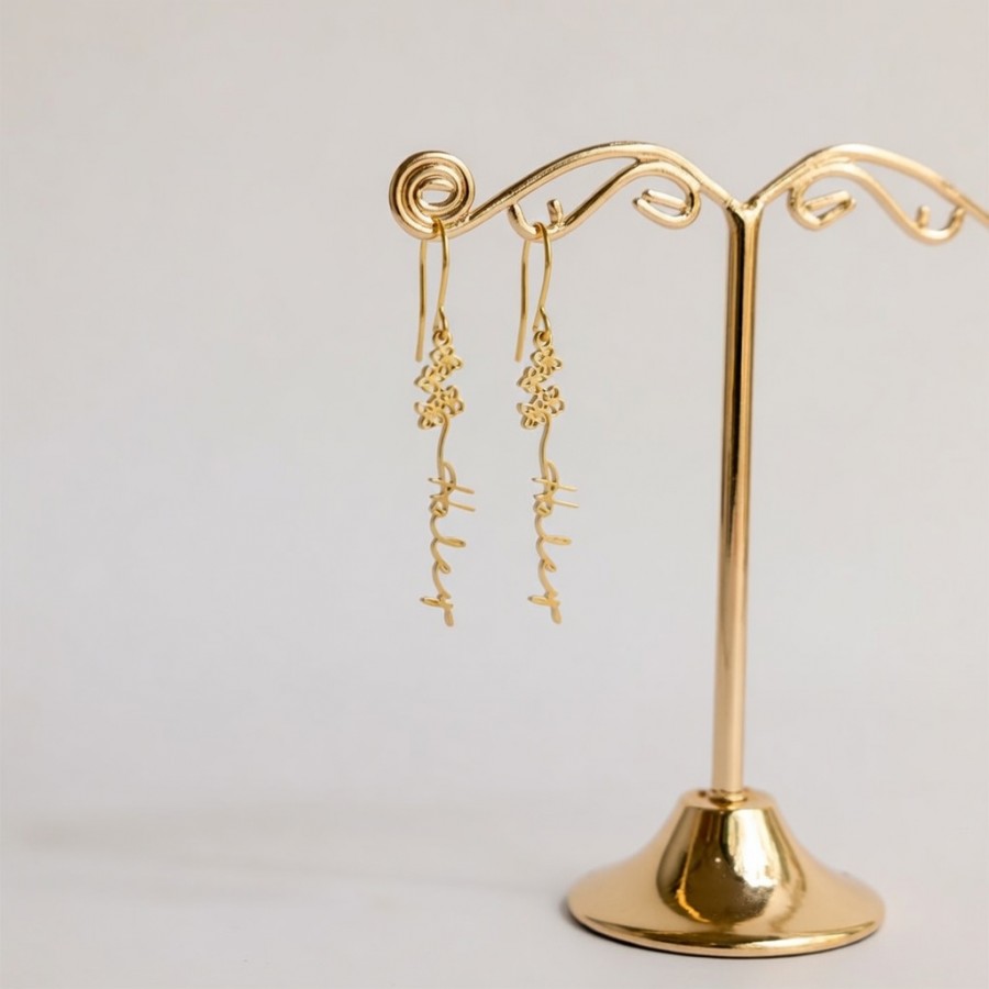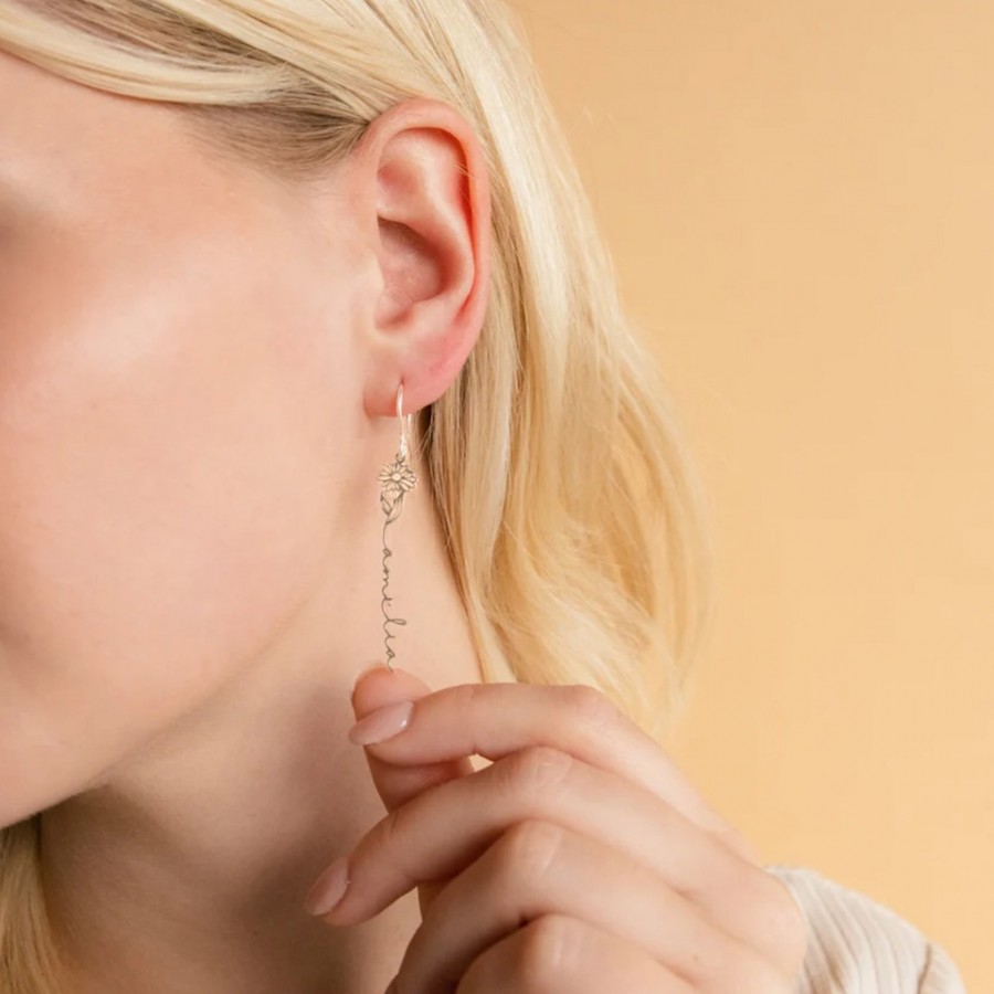 Custom Birth Flower Name Drop Earrings Gold Silver Personalized