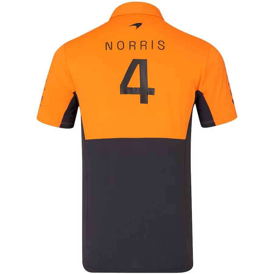 The official 2024 McLaren F1 Lando Norris Team Polo, designed and produced by Castore, with all the official 2024 team and sponsor branding. As worn by the team during the 2024 Formula 1® season, the polo comes in a performance fit with a clever concealed placket and large McLaren Formula 1® Team logo print across the rear.