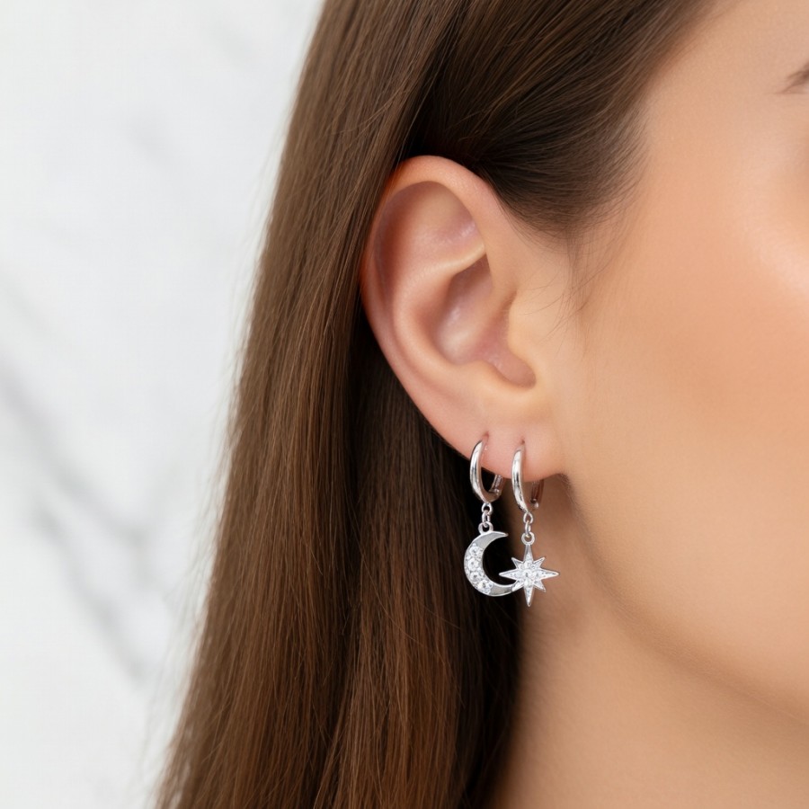 These versatile asymmetrical moon and star earrings (6mm) come in gold and silver, adding a touch of ethereal beauty to your starry-sky look. One earring features a crystal-encrusted crescent moon, while the other is adorned with a shimmering star pendant, creating a unique and captivating asymmetrical aesthetic. The earrings feature a delicate hoop design, making them lightweight and comfortable for all-day wear. The gold and silver colors are versatile and easily complement various outfits, making them the perfect accessory for stargazing enthusiasts and space lovers.