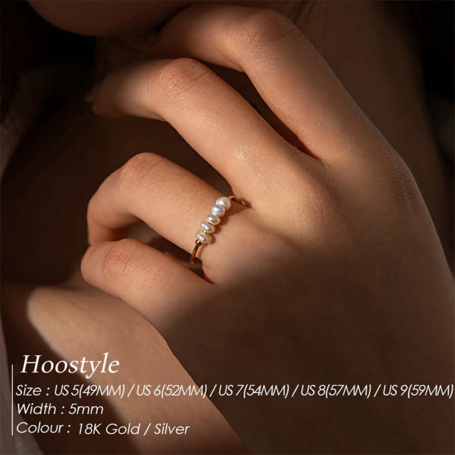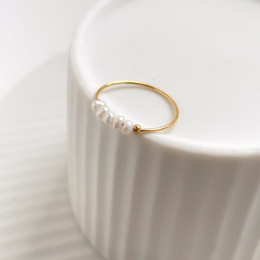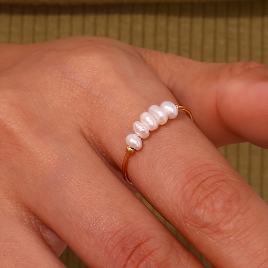 This delicate freshwater pearl ring adds a touch of elegance to your everyday look. Five irregularly shaped natural freshwater pearls are strung on a slender band, giving your fingers a soft, lustrous shine. Available in 18K gold and silver, the ring's simple design makes it a versatile piece that can be layered with other rings or worn alone, a true staple in any jewelry collection. Whether you're treating yourself or gifting it to a loved one who appreciates understated timeless style, it's the perfect choice.