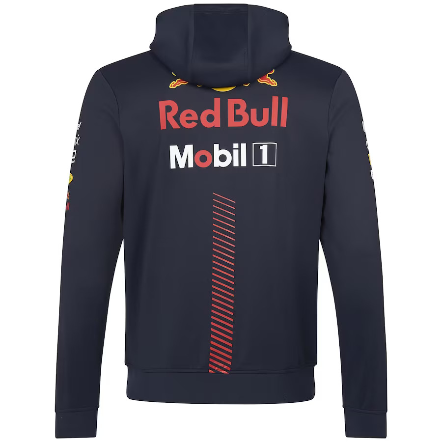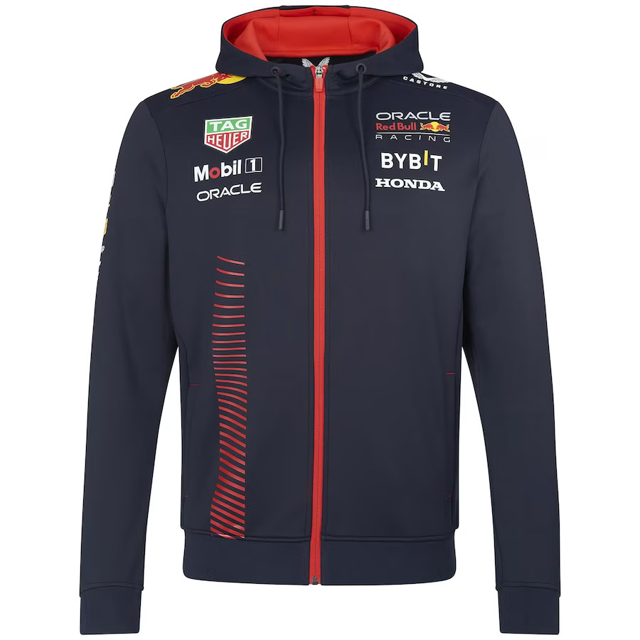 The official Castore x Red Bull Racing 2023 Team Zip Hoodie, complete with full length front zip, adjustable drawstring hood, and precision printed team and sponsor logos as seen across the Oracle Red Bull Racing Teamline range during the 2023 F1 season.