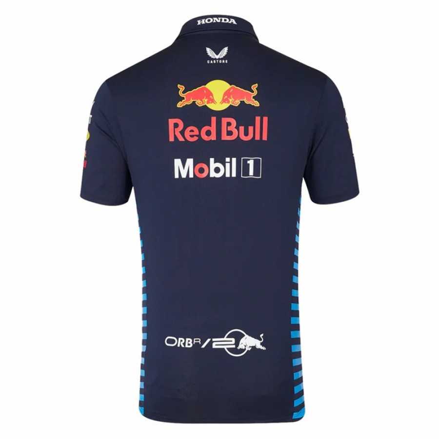 The official 2024 Red Bull Racing Team Polo, designed and produced by Castore. As worn by the team during the 2024 Formula 1® season, the polo comes in a regular fit with a clever concealed placket and screen-printed graphic across the rear.
