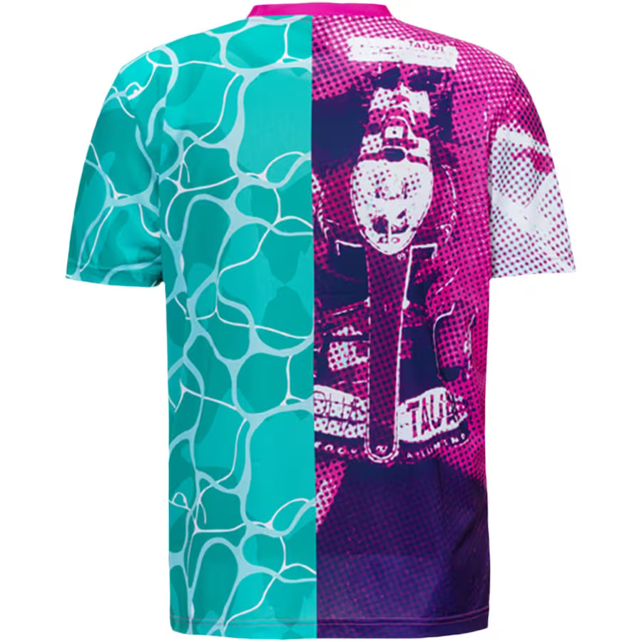 Designed specifically for the Miami Grand Prix. Features a distinctive split design with a magenta/purple graphic on one side and a turquoise/aqua water-inspired print on the other. The team logo is displayed on the chest. It is made of high-quality polyester, offering a comfortable and lightweight feel.